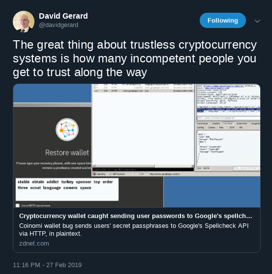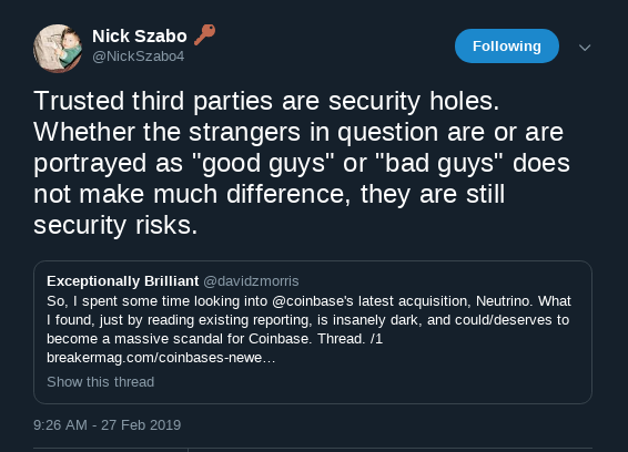 Yet, in many ways, we’re still the same people we were in the Middle Ages. Our technological and scientific progress has way outpaced our overall development and capacity to accommodate and organize that many variables, correlations, and inter-dependencies. To quote the famous George Carlin, “We’re just semi-automated beasts with baseball caps and automatic weapons.” Democratizing something inevitably first unleashes the lower passions of the crowds and some things mustn’t be left to insufficiently incompetent and narrow-minded individuals. But it’s not altogether clear where Szabo draws the line since blockchains and smart contracts are themselves trusted third parties, though perhaps ones that afford some degree of trust minimization under some circumstances.