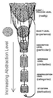 The structural differential was used by Korzybski to demonstrate that human beings abstract from their environments, that these abstractions leave out many characteristics, and that verbal abstractions build on themselves indefinitely, through many levels chained in order (depending on how many levels we want to filter through to access what). The highest, most reliable abstractions at a date are made by science, Korzybski claimed (e.g., science has conveyed the nature and danger of bacteria to us), and that is why he attached the last label back to the parabola as verifiable and grounded in factual reality.