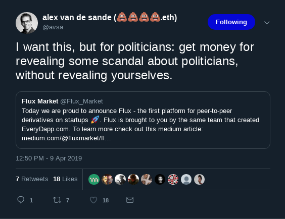 Flux is an attempt to channel the hyperactive surplus energy of #CryptoTwitter along market lines that builds on Augur, integrating 0x relayers and off-chain order books functionality with the MakerDAO-managed stability of the Dai stablecoin. In that respect, it follows the tendency of user-friendly Augur overlays that abstract away complexity in favor of usability and adoption that was started with Veil and Guesser. Flux narrows down the category of derivatives it would focus on to those based on topics related to tech startups, whether crypto-related, VC funded (Ycombinator, etc.), or otherwise. That implies betting “on startup milestones, funding, products, or even scandals.” Scandals are obviously a big thing in crypto nowadays, especially in the realm of social media.