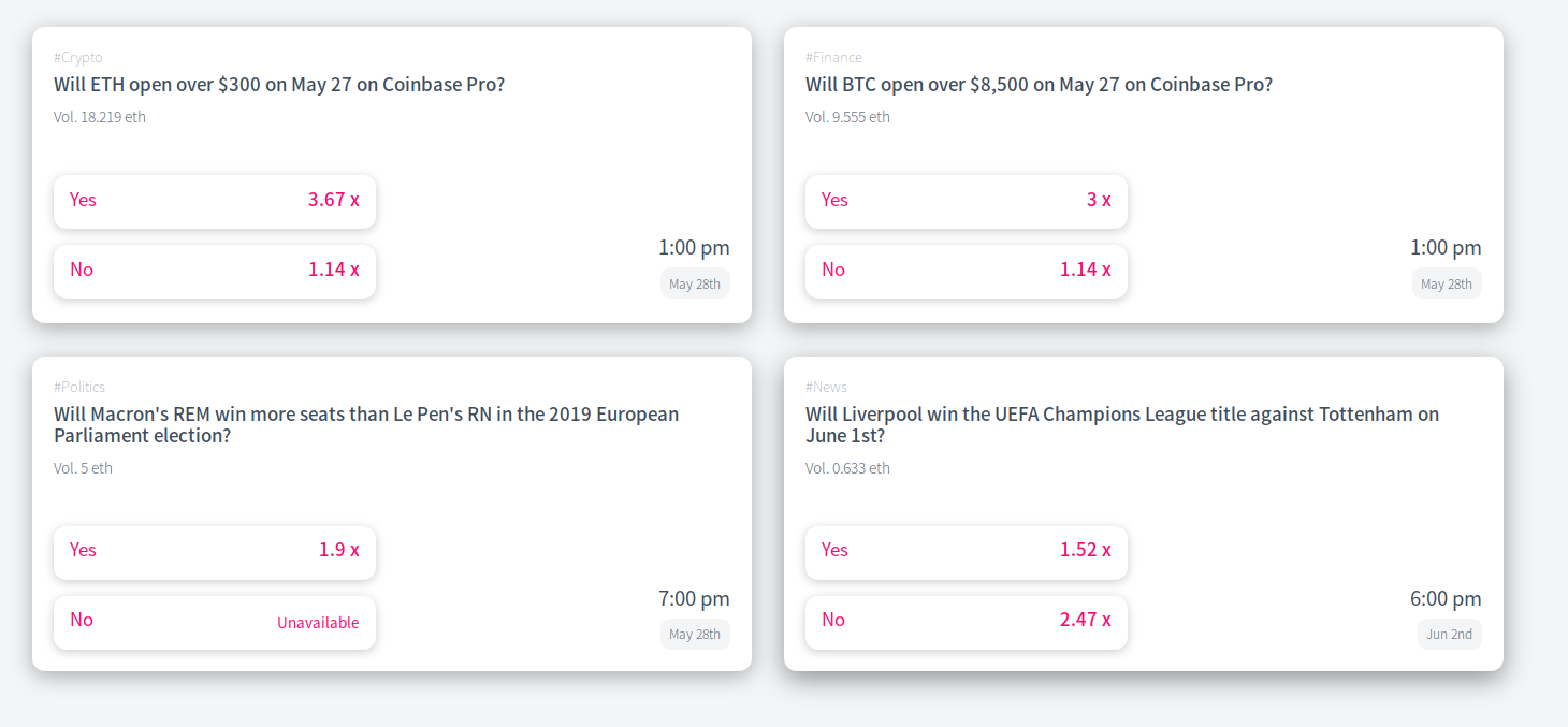 A number of Augur protocol overlay dApps have been launched over the past few months, however, which provide a more stripped-down and user-friendly protocol variation with a more streamlined user experience, featuring fast market resolutions and curated lists of markets to focus trade on. These dApps include Veil and Guesser, which I have previously written about. (The latter is focused on offering the simplest possible, most stripped down and easy to use front-end, limited to four binary options markets at a time.)