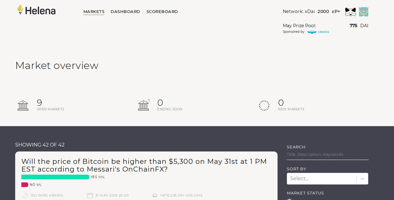 Helena is an altogether differently structured PM. Incubated at ConsenSys and powered by the Gnosis prediction markets protocol and tools. It is nonetheless still centered around things cryptosphere-related and geared towards extracting crowdsourced insights relevant to the industry. Upon signing up and being approved as a platform “insight provider”, one is issued 2000 xP (proton) tokens and 1 xDai (to pay fees with, as Helena is the first dApp to go live on the xDai sidechain, massively reducing transaction fees and confirmation times at 5 seconds block time and gas fixed at 1 Gwei – paid in xDai). One then uses the tokens to bet on the markets, which are predominantly Ethereum and Bitcoin oriented (whether related to technical fundamentals, system metrics or market price valuations).