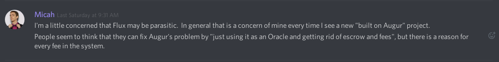 Conversely, Flux could be harnessed to incentivize other kinds of behavior. For instance, betting on developers as if they were racehorses at the track, (a fitting prospect given the size of some of their salaries these days), or moving disputes from Twitter into their respective markets, meaning predictive statements would be measured in terms what the tweeter is willing to back his position with (“putting one’s money where his mouth is”). Directly associating the risk with the individuals taking that risk is one of the core ideas underlying prediction markets and the broader notion of market efficiency.