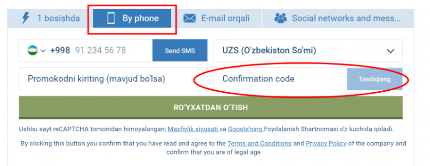 The next option to create an account is by phone. This is a very convenient way and it has increased protection. By linking your account to a mobile number, there is no risk that you will be hacked. Access to the account will become available after you fill in the empty fields and enter the code from the SMS. It is also possible to register via email. Here the questionnaire is extended, because, in addition to e-mail, country, city, currency, and promotional code, you immediately need to enter a mobile phone number, last name and first name, and password.