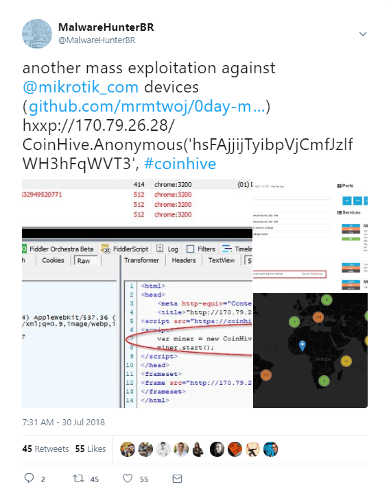 A recent tweet from an independent malware investigator reports a “mass exploitation” of MikroTik routers for the purpose of cryptocurrency mining. The attacker hijacked the routers, then injected the code for the Coinhive miner into web pages served by the routers in question.