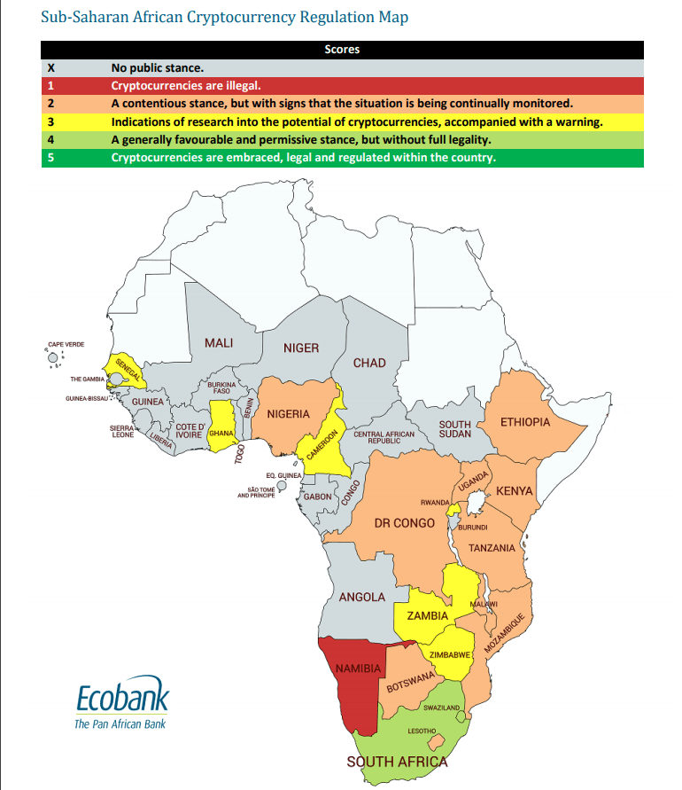 Many African governments and regulators recognize both the risks and the potential positive impacts of cryptocurrencies, and some also appreciate the difference between cryptocurrencies and the underlying blockchain technology. But they have been reticent in authorizing cryptocurrency transactions / Ecobank Middle Africa Briefing Note