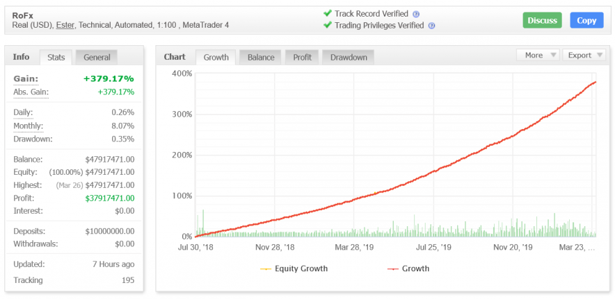 Now, let us get to the statistics on the chart. The account started trading with a deposit of $10000000 with a balance of $47917471. This means that the account has made a profit of $37917471. The account has 100% equity, which is brilliant. Daily profit is 0.26%, and monthly profit is 8.07%. The drawdown is impressively low, 0.35% only. At present, the gain and absolute gain of the account are +379.17%.