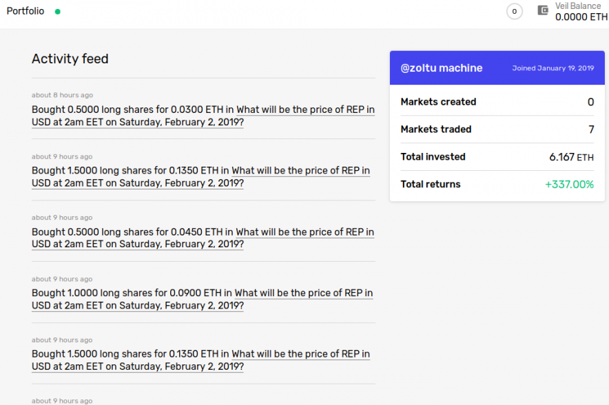 Another defining feature of Veil is its use of the 0x protocol in handling exchange and maintaining a distinct order book specific to Augur’s prediction markets. All markets listed on Veil are represented as Augur markets on Ethereum, with ETH used for payments (and Dai to be eventually introduced) and REP as the means for resolution (i.e., the oracle).