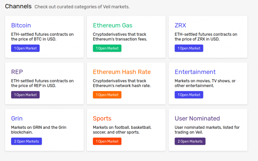 Veil supports binary (yes/no, short/long) and scalar (likelihood expressed in ETH) Augur markets (without categorical/multiple choice ones) and is particularly focused on crypto derivatives (such as Bitcoin futures or Ethereum gas prices). These are interesting, useful markets because they bring exposure to Bitcoin on Ethereum (another mechanism for that is wBTC, or wrapped Bitcoin, the subject of an upcoming article on wrapped tokens), while the gas price and hashrate markets are a robust hedging instrument for relayers paying gas for users.