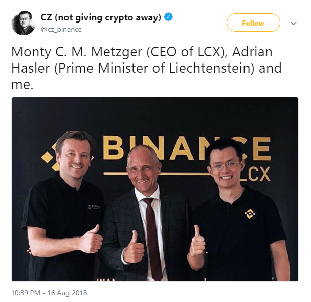 We welcome Binance LCX to Liechtenstein. Blockchain technologies are laying the basis for an entirely new industry. We are confident that Liechtenstein’s existing and future legal framework and practice provide a robust foundation for the Binance LCX and other Blockchain companies to provide exceptional services here in Liechtenstein.