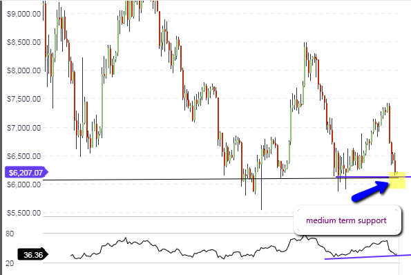 The daily chart shows the selloff that has occurred since Wednesday, and also shows that price action has found support at the medium term support line. This support line can be traced all the way back to the 2nd week of July. We need to see the daily candle below this line for the price action to actually reach the long term support level of between $5,800 and $5,900. If the daily candles for Sunday, Monday and Tuesday do not break this line to the downside, then we may see some stronger buying off this support line. But if the daily candles break this line, then expect the price action to get all the way down to logn term support of $5,800/$5,900 before buying resumes.