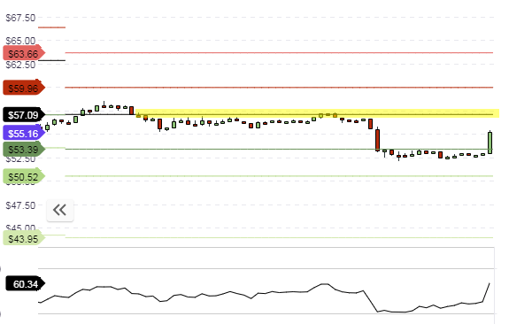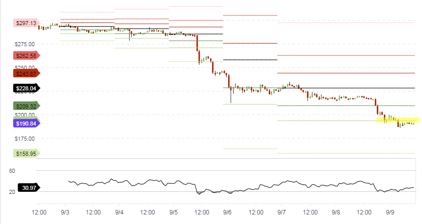 The hourly chart shows that price has broken below the S2 pivot, but the price action has begun to turn up again. It is not very likely that much downside movement to the S3 pivot ($158) will occur, as price has already started to find support at the S2 area ($190.84). Therefore, intraday price action is expected to be located between the S2 and S1 pivot areas.