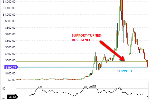 ETH/USD has dropped below the $200 mark and is struggling to find support. The weekly chart shows that ETH/USD has touched the $190 mark, with new support expecting to be found at this price area. The previous support-turned-resistance is located at the $290 mark. This leaves a new long term range between this support area ($190) and the horizontal resistance at $290.