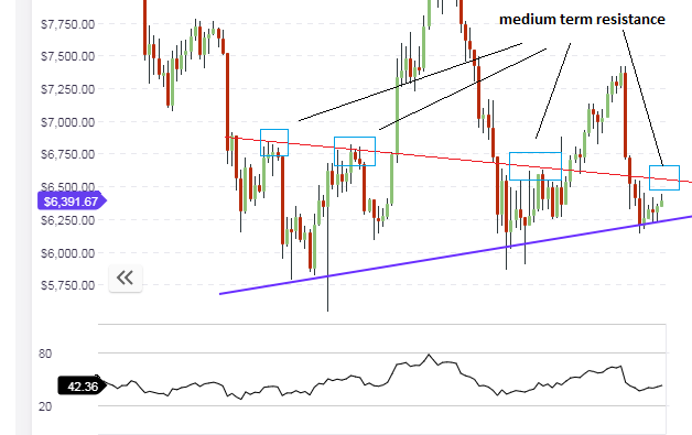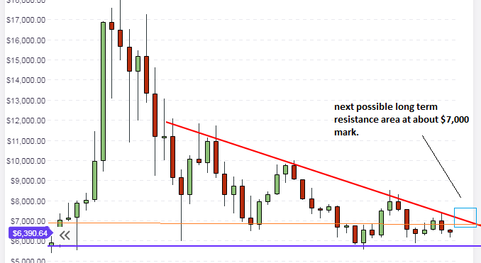 The daily chart shows that prices have started a very slow rally from the medium-term support line (shown in blue). This line continues to be the reference point for medium-term bullish price movements on BTC/USD. The next medium-term resistance to upside movement is within sight at the $6,800 mark. If this resistance level holds, then price would find itself locked in a symmetrical triangle. There would be some tests of this resistance area and if the bulls are strong enough, there may be a possible upside break of the red resistance line, allowing BTC/USD to attain the long-term highs that are expected to be seen at the $7,000 – $7,100 mark.