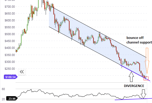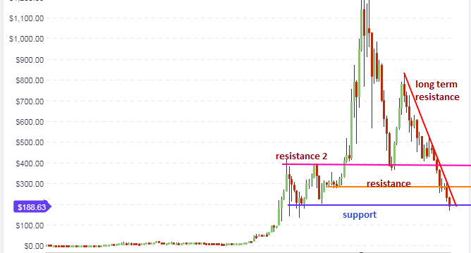 ETH/USD continues to bear the brunt of the market bearishness. On Wednesday afternoon, it touched the $165 mark and it really looked like the bottom was about to come off. However, ETH/USD has staged a recovery coming into Thursday morning and is now trading at a little lower than $190. The price action is still sitting on the support line, but only just. The support is still under severe pressure and will continue to be for some time to come. If price is able to push off from the support line, then it will target the first resistance level at $290. Other resistance areas can be seen above this, but price will have to break above the $290 mark before these other areas are seen.