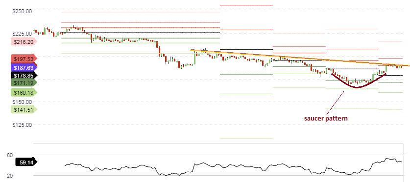 The hourly chart reveals that the price action for the week ended up forming a bullish reversal pattern known as the saucer. However, upside movement from this pattern has stalled at $187.63; a level which also corresponds to the R1 resistance. Traders will therefore have to watch for an upside break of the R1 pivot, which will open the door to a price move to the R2 pivot level of $197.53.