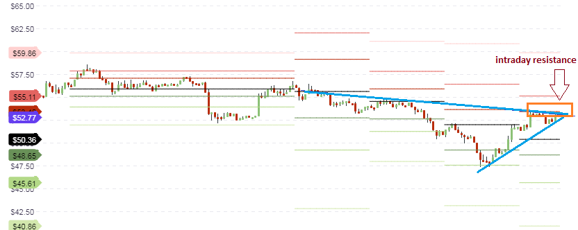 The hourly charts show prices capped by an intraday resistance line which stretches back to the beginning of the week. This resistance area is located at the R1 pivot resistance ($53.48). Price is also being supported by a rising trendline which pushes midway into the distance between the central pivot below and the R1 pivot above. Traders would be looking for a break of the R1 pivot line so as to follow prices upwards. This would be the trade setup that would be in tandem with the support bounces seen on the long term and medium term charts.