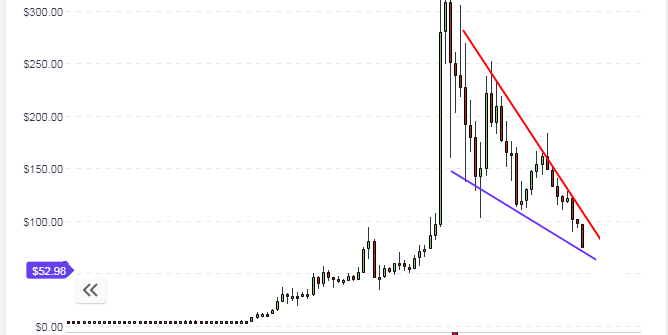 LTC/USD took a major hit in Wednesday’s trading, but has been able to come off the pivot lows. The long-term chart shows that the asset is moving within the boundaries of a falling wedge. However, this pattern is still in evolution and it will take some time for this pattern to resolve. Price action is finding support at the $45 area, which is the lowest that LTC/USD has been since December 2017.