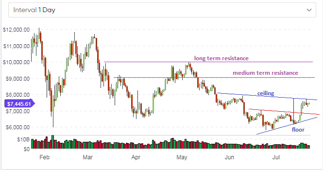 Failure or price to push above this resistance will see prices headed downwards towards the floor prices of between $6600 and $6700.