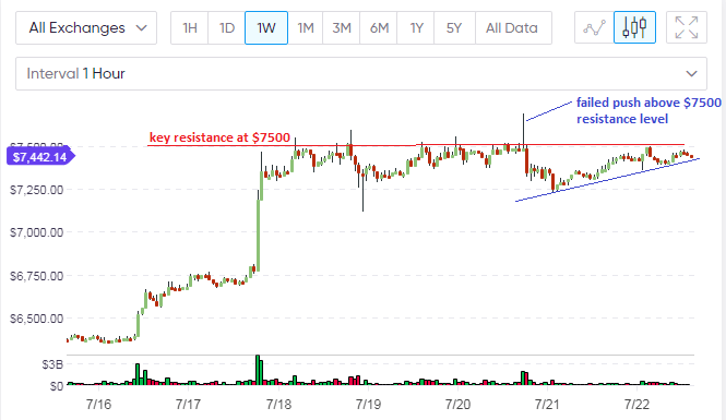 BTC/USD tested the resistance level identified in the last analysis at the price of $7,450. After testing this area several times, buyers began an ambitious push to send Bitcoin prices above this resistance, but sellers aggressively forced them down. We see this on the long doji candle on the hourly chart below.