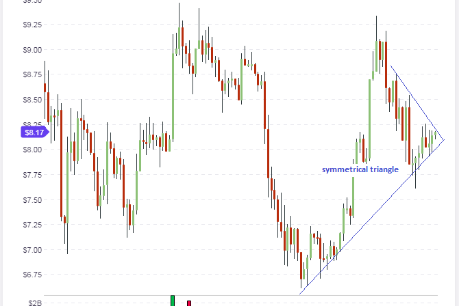 The 4-hour chart reveals that a symmetrical triangle is in formation. With the asset in a downtrend, the bias is for the price to break downwards.