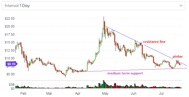 The daily chart for the EOS/USD confirms our medium-term view on the EOS/USD asset, which is that the downtrend will persist. This is because of the descending upper trendline which has continued to limit the upside. At the time of our last analysis, the price was at 8.6022, but this has declined to 8.0609. The presence of the bearish pinbar at the trendline confirmed the downtrend.