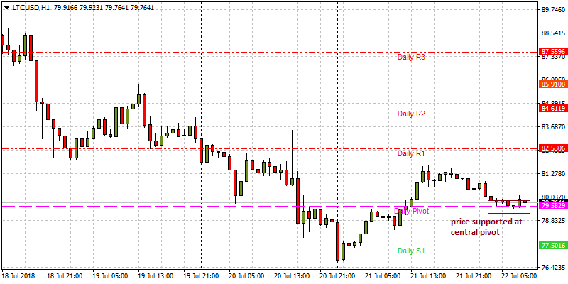 Prices have started to trend downwards again, but intraday trading charts shows the price of LTC/USD moving in a sideways trend between the central pivot point and the R1 resistance pivot.