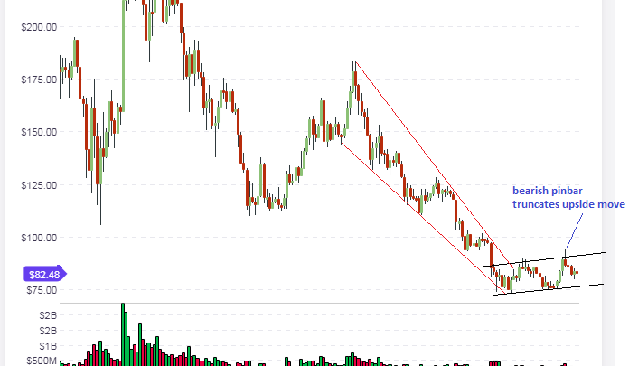 As far as long tern charts are concerned, BCH is now in a channel, which resembles a bearish flag formation when the prior downtrend extending from Q1 2018 is considered.