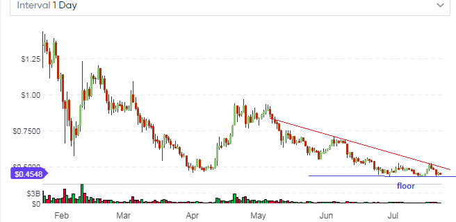 The long-term focus for Ripple has not changed. Upside is still limited by the descending trendline, which is starting to push hard at the floor price of between $0.39 and $0.42, depending on which exchange you are getting your price feeds from.