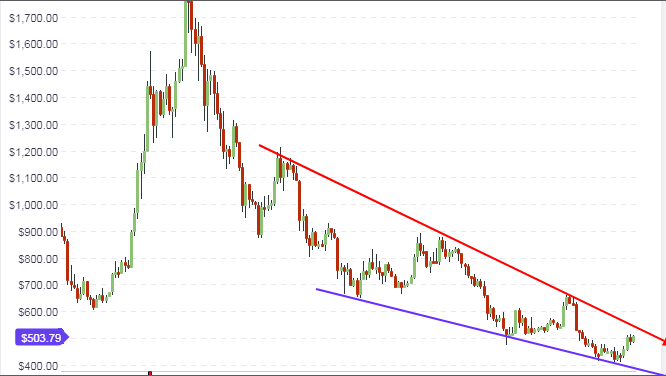 The initial horizontal resistance on the daily chart is at the $590 mark, which also corresponds to the area where the descending trendline meets the resistance line that was formed by a broken support line at the same price. Prices are expected to test this level and if there is still no positive news in the crypto market to drag up prices above these levels, we may see sellers entering into the fray. Traders should carefully watch the order books on the exchanges to see when a mass of sell orders have started to flood the market.