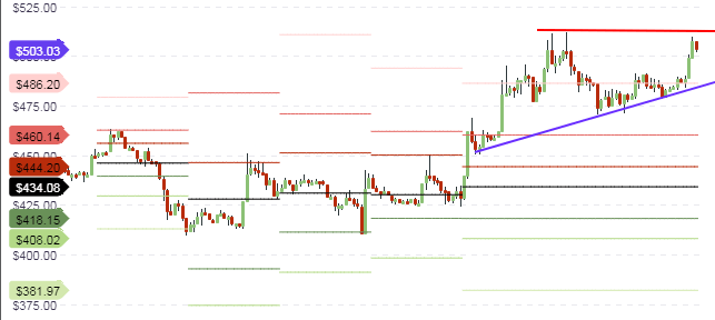 The hourly chart shows price trading very close to the intraday resistance line at $508, with a rising support line propping up prices from below. Price action has to break above the intraday resistance to continue the upside push to $590. Until this happens, price action may continue to trade within the range of $486 and $508, which mark the boundaries of the trendlines shown on the intraday chart.