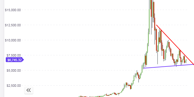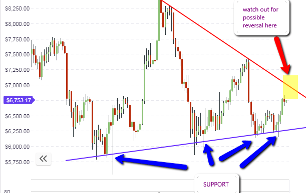 BTC/USD’s long-term chart shows that the weekly candle has picked up steam and is bullishly heading towards the red resistance lines. This resistance line is formed by progressively lower highs, therefore it is likely that the long-term resistance may not go beyond the $7,000 mark. Price is currently $250 below this level, so we may see this resistance area being tested before the week runs out if the bullish momentum of the last three days is sustained.