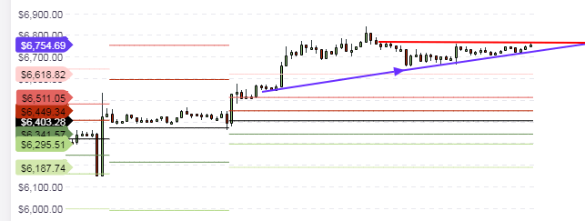 For intraday traders, the focus for trading continues to be on the pivot points. Day traders have to exercise maximum caution this week, as price action starts to approach the long-term resistance. This is no longer the time for day traders to leave long positions unattended to. But for the day, price is presently capped at the $6,754 mark and we also see a support line propping up prices from below. We have to see price action closing above the intraday resistance level of $6,754 for further continuation of the bullish march to the identified resistance level. It is best to allow price action to decide on what moves should be made on an intraday basis.