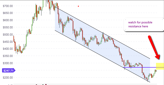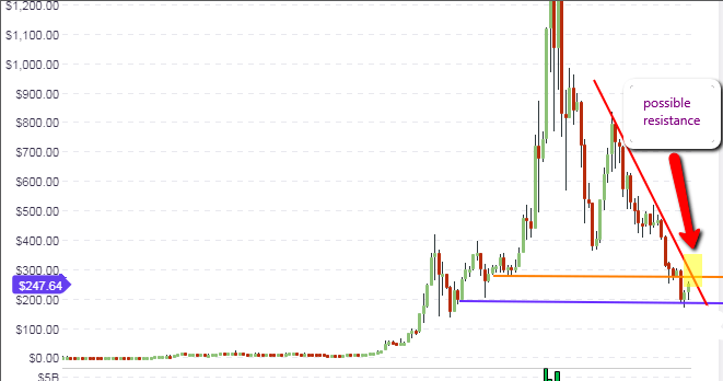 ETH/USD continues its slow march to the upside as it continues its slow recovery from the lows of the last two weeks. The second most valuable crypto in terms of market cap is currently trading at $247, and finds itself now targeting the $290 resistance level above, marked by the intersection of the horizontal resistance line (orange line) and the descending long term resistance line (red).