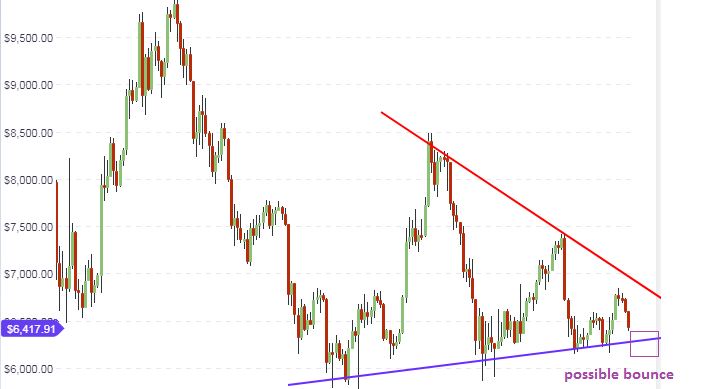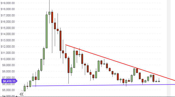 The BTC/USD long-term chart shows that prices have retreated from the week’s open. Bitcoin is presently trading at slightly less than $6,400 on the back of continued bearish sentiment and reluctance of the bulls to go all out to push prices higher. It must be noted that price action within the descending triangle seen on the long-term chart is gradually inching towards the apex, by which time something will have to happen. Either prices will be pushed up by positive news in the market (such as approval of a Bitcoin ETF), or they will be forced down by technical plays, as buyers are getting out of any rallies at progressively lower prices.