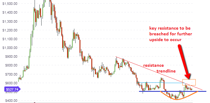 We can see that price action will be limited at the 38.2% Fibonacci retracement level at $590, with this area serving as the major resistance level on the long-term chart. For this price level to be achieved, price action has to break above the $530 price level. The 23.6% Fibonacci retracement price area is providing support for this move, as we can see from the chart.