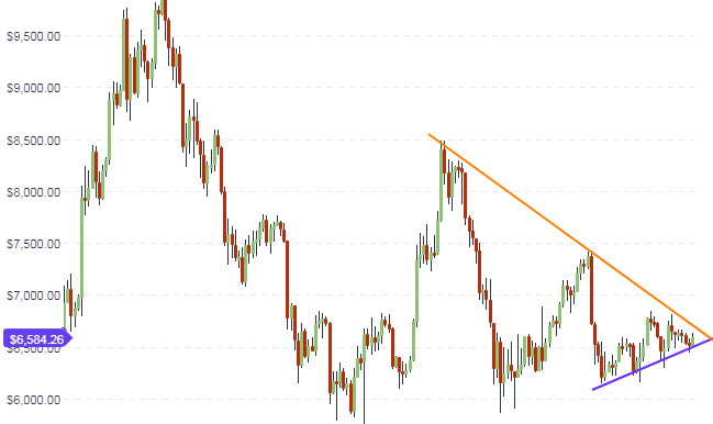 With very little change in the long-term outlook for BTC/USD, the daily chart will be the main focus of today’s analysis. We continue to see price action limited to the downside by the blue ascending trendline, and to the upside by the orange descending trendline. These lines form a symmetrical triangle. We are getting close to the apex of this triangle. We could see a huge price breakout as early as next week. At the moment, the bias for such a move is to the downside, and if this occurs, we could see a move all the way down to the $5,800 mark before price will find support. Any chance for an upside breakout will have to depend on very strong market news; it is hard at this time to see where that is coming from.