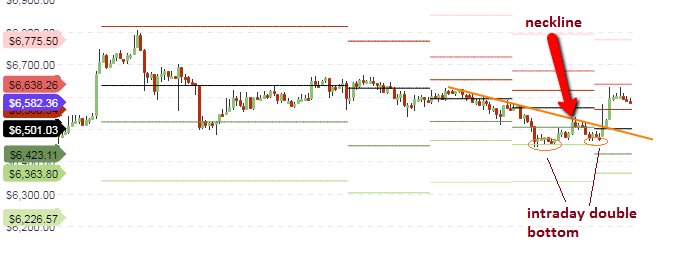 A look at the hourly chart shows the presence of an intraday double bottom. This was occasioned by the downside price moves and recovery that happened on Monday and Wednesday. The intraday sloping resistance levels of the week provided the neckline for this pattern, and we saw the upside break of this trendline push this pattern to resolution in Thursday’s early hour trading. Price is retreating to the R1 price pivot. Whether this pivot will hold or not will be seen in today’s trading. If it is broken to the downside, then we will see price action trading down to the central pivot at $6,500.
