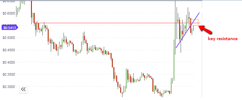 If the 50 cents resistance area is broken to the upside, the price could move upwards to test the next resistance level at 80 cents. Failure of price action to break the 55 cents resistance will see it pushed downwards to the next support level at 50 cents.