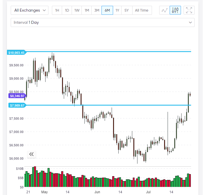 Bitcoin has continued higher this week as expected, blasting through key resistance and the 200 moving average on the daily chart, testing $8,500 before Tuesday’s close. If you recall, in a previous article, I wrote that
