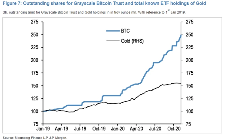 JP Morgan based this observation on Grayscale’s Bitcoin Trust, which it says outperformed gold ETFs in terms of outstanding shares:
