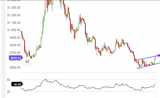 While the long-term chart shows that price action has bounced off the long-term support, the daily chart shows that the price of BCH/USD is testing the upward channel resistance line, which is also very close to the next medium-term resistance at the $680 price level. The daily candle is presently assuming the shape of a pinbar. We need to wait for the candle to close to determine if the price has broken above the upper channel line, or will retreat and remain confined to the borders of this channel.