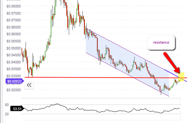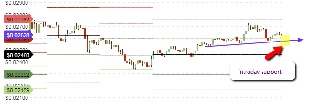 Intraday, we see that the price action is turning downwards and is probably going to find some support at the identified blue support line. This line coincidentally is expected to cross the R1 pivot of $0.02594, which will probably reinforce this area as a good intraday support. It is likely that there will be a brief upside to price action as it attempts another test of the medium term resistance located at the upper channel line. However, if the intraday support is broken at any time within the day, then expect the price of TRX/USD to attempt a push to the central pivot, within the context of a continuation of the downtrending channel.
