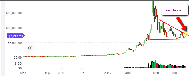 The weekly BTC/USD chart shows that price action continues to remain within the boundaries of the triangle that has been identified. As has been the pattern for several months now, price action has bounced off previous lows and is heading towards the descending trend line that serves as the long-term resistance. The weekly candle looks set to close the week at above $7,200, which is very close to the resistance area. Extrapolation of the descending trendline resistance shows that the initial resistance that will be encountered by the latest upside price move will be at the $7,500 level. We expect this level to be attained this week and tested several times if the upside momentum continues.