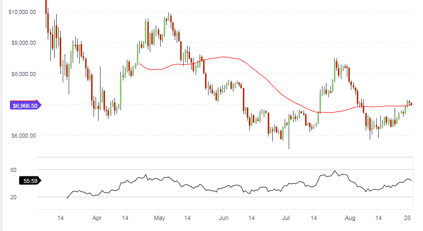 As before, the outlook for long term trading on the weekly BTC/USD chart remains unchanged. The weekly candle looks set to close the week on a higher note, but there are signs that further upside will be tapered by the descending trend line which looks set to touch the price action at just above the $7,000 mark. Bitcoin continues its gradual rally from the long term support of $5,700, and has been unable to cross above $7,100. At the moment, BTC/USD is holding above the previous short term resistance at $6,800. This broken short term resistance is now holding Bitcoin prices above this prive level. The end of the week and the closure of the weekly candle will determine whether BTC/USD still has further upside left or not.