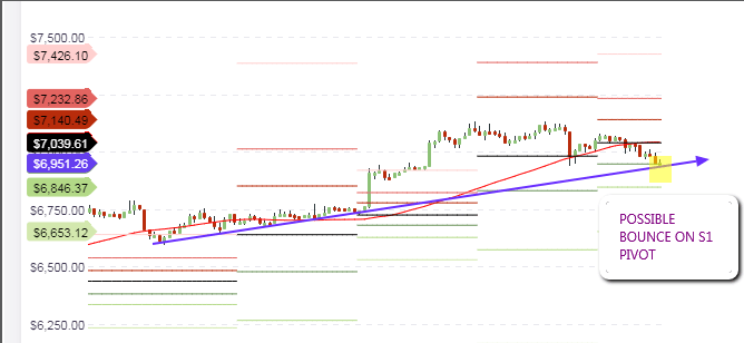 Intraday traders who follow the hourly chart can see that the price action is presently bouncing on the S1 pivot at $6,951. This pivot may prove to be strong enough to support a mild upside at least to the central pivot at $7.039. If this pivot fails to hold up prices, we may see further downside for the day, at least the S2 pivot at $6,846.