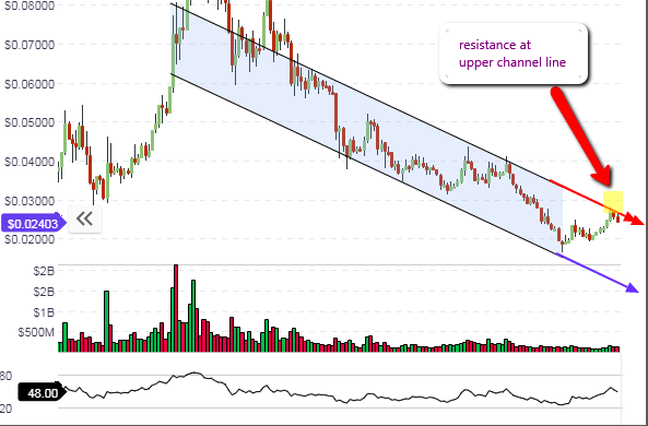 A lot will depend on the reaction of HODLers of TRON. If the investors fail to be impressed by the TVM launch, we may see a sell-off which will push down prices at least to the lower channel line, which presently offers some support. The channel is downtrending, which means that the bias of the market is still bearish. There needs to be a strong bullish reaction from TRON investors to tomorrow’s news to prompt an upside move that will break the upper channel line and produce a true upside reversal.