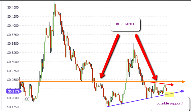 The intraday chart reveals that the price action has found support at the same area where a horizontal support has been found. This is at just below the $0.25 mark. We may see a short bounce to the S1 pivot ($0.2171) from present price levels at the S2 pivot ($0.2109), before a renewed round of selling ensues in an attempt to force prices to the lower triangle border. Therefore, selling on rallies to a pivot point may be the way to go so as to align with the picture on the medium-term chart.