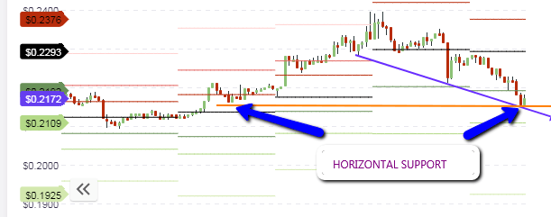 Stellar Lumens is showing some good tradable setups on the daily and intraday charts. The daily chart shows price action contained within a symmetrical triangle, with price action heading down to the lower border of this triangle. This is coming on the back of price rejection at the upper border of the triangle, which coincided with a horizontal resistance line.