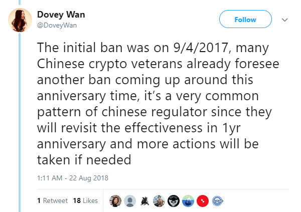 The first news to break about China’s latest crackdown came in the wake of an August 17 ruling released by the Chaoyang District government banning hotels, offices, and malls from hosting crypto-related events in Beijing’s Chaoyang district. Chaoyang is the epicenter of fintech in Beijing. As Dovey Wan, managing director at Danhua Capital, pointed out on Twitter, since Chaoyang is a symbolic district, the ban there essentially sets the tone for the government’s attitude to crypto events across China. Wan is among the most influential voices discussing the bans on social media. Her Twitter response to the news provides an excellent step by step commentary from within the Chinese cryptosphere. Among her comments was the statement that the new bans are unsurprising given the upcoming anniversary of the ban on exchanges and trading:
