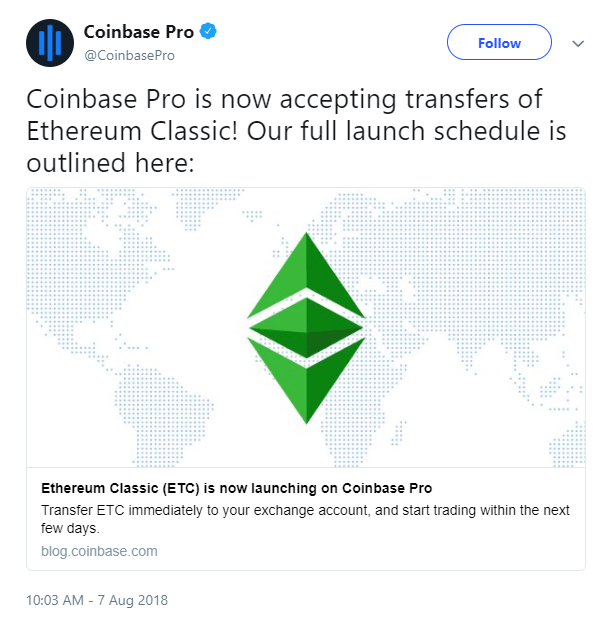 August 7 was a day of announcements for Coinbase. In a separate blog post, the exchange also announced the listing of Ethereum Classic (ETC) on its Coinbase Pro platform: